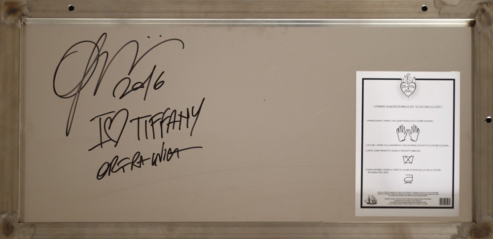MARCHEGGIANI PEP (PESCARA 1971), I love Tiffany, Stampa quadricromica su acciaio supermirror con cofanetto in compensato Anno 2016 Dim. 35x70x2,1 Certificato di autenticità Al verso adesivo istruzioni, firma, titolo, data e la dicitura opera unica