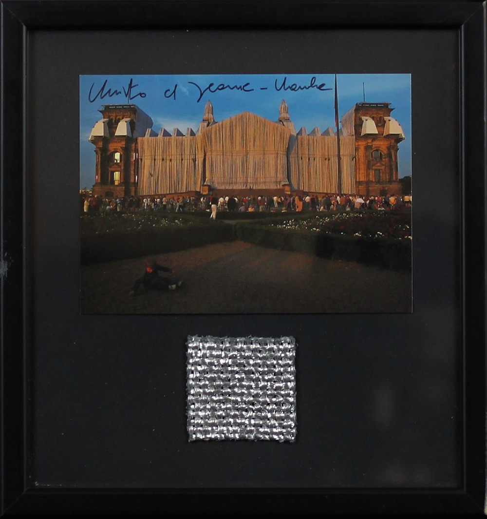 CHRISTO (Gabrovo 1935), Senza titolo, Cartolina autografa con stoffa Dim. 17x12 Firmato in alto