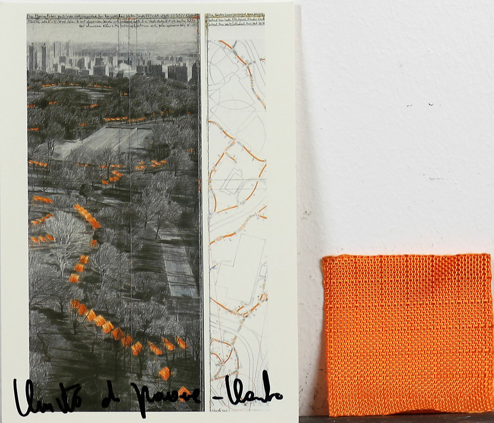 CHRISTO (Gabrovo 1935), Senza titolo, Cartolina autografa con stoffa Senza cornice Dim. 14,5x10 Firmata in basso