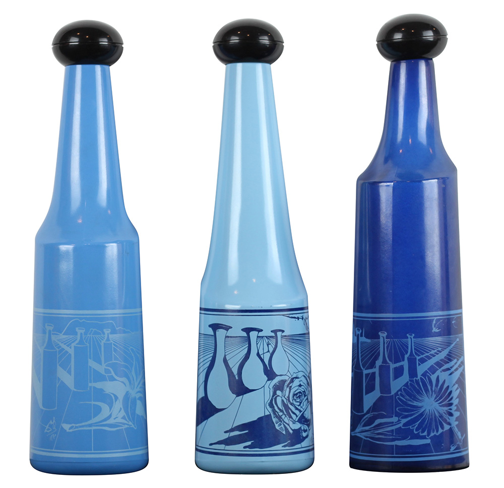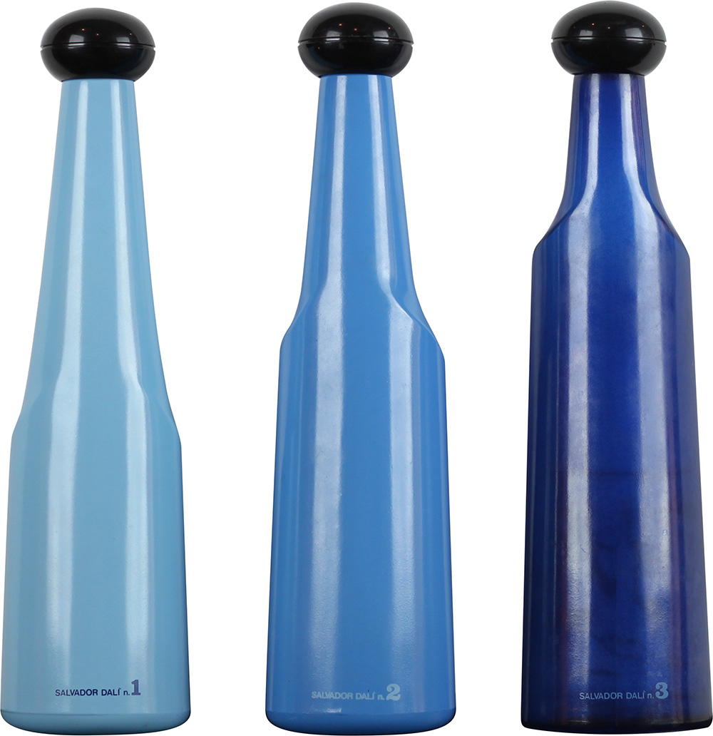 DALI SALVADOR (FIGUERES 1904 FIGUERES 1989), Bottiglie, Bottiglie in vetro Anno 1972 Dim. 34X9 Collezione completa di 3 bottiglie in vetro create per Rosso Antico, noto marchio di vino da aperitivo, disegnate, firmate e numerate da Salvador Dali Bottiglie numero 1, 2 e 3