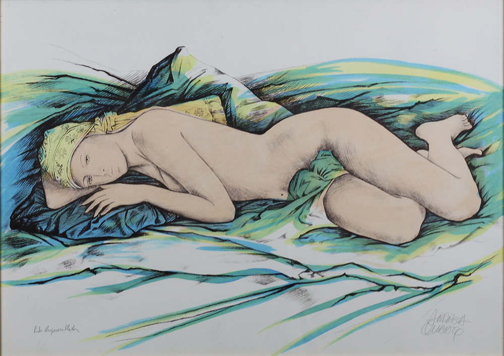 QUARTO ANDREA (LUCCA 1959), Nudo disteso, Litografia aquerellata Anni 80 Dim. 50x70 Esemplare unico Tecnica in basso a sx Firmato in basso a dx