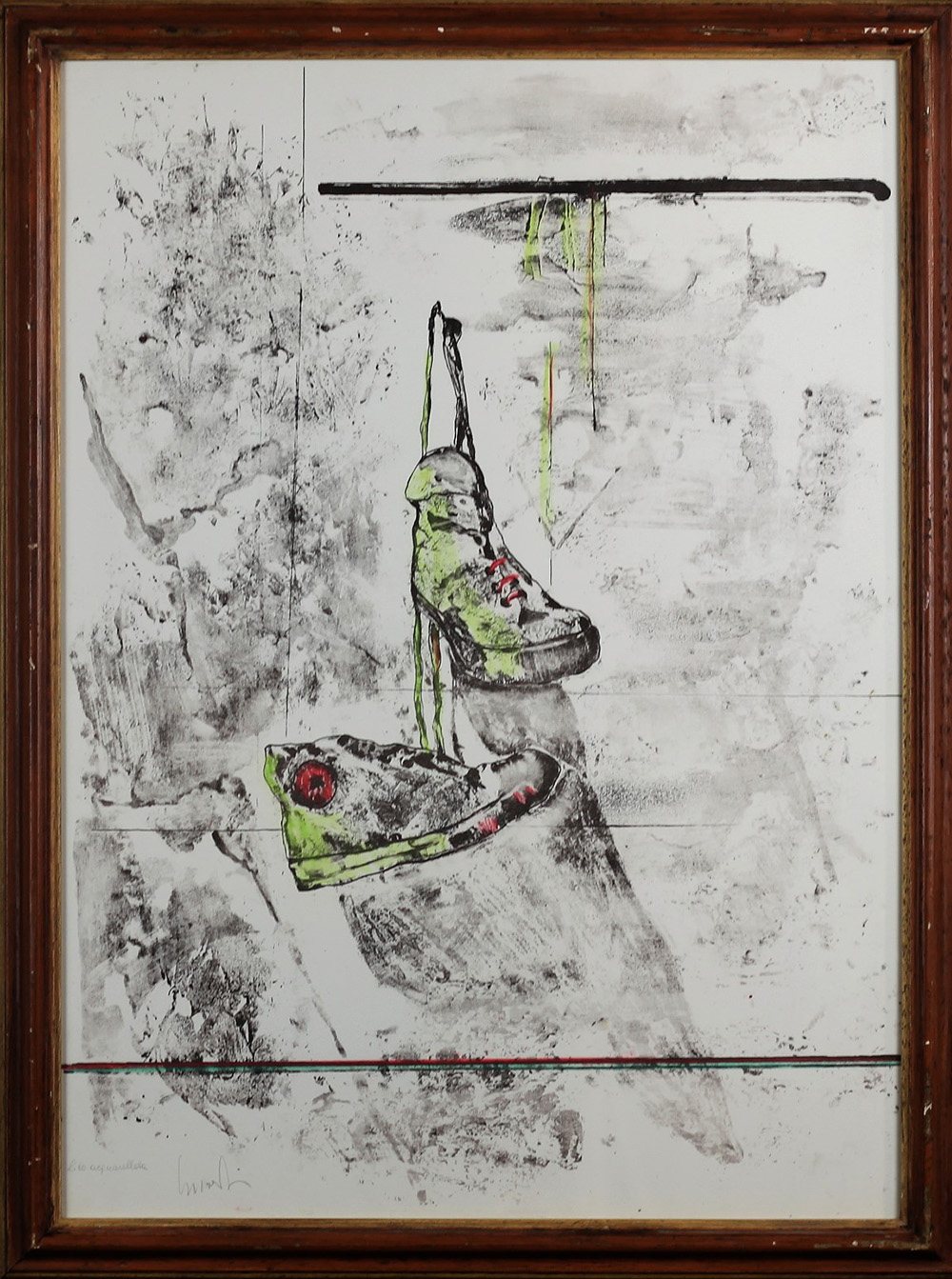 MOSTI PIERO (MASSA 1941), Scarpe da tennis, Litografia acquarellata a mano Anni 70 Dim. 70x50 Esemplare unico Tecnica e firma in basso a sx
