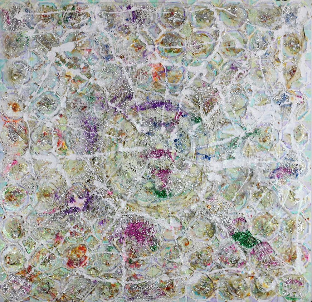 BRUNO LAURA (CASALBORE 1956), Arabesque, Acrilico, olio e materiale vario (gesso stoffa) su tela su tavola Dim. 100x100 Anno 2017