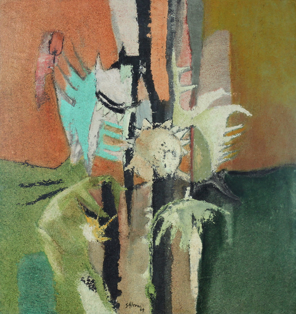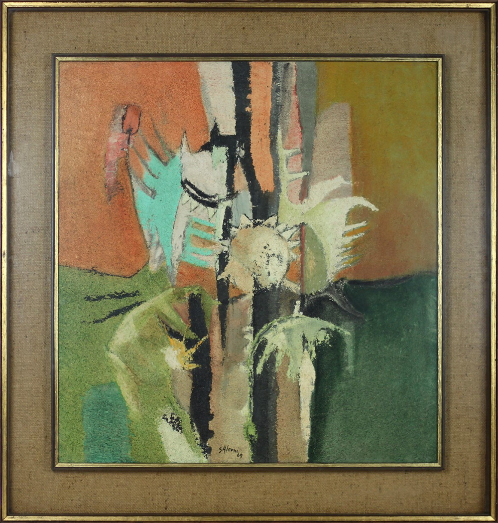 SALERNI ENZO (1929), Composizione, Olio su tela Anno 1969 Dim. 63x60 Firmato e datato in basso al centro