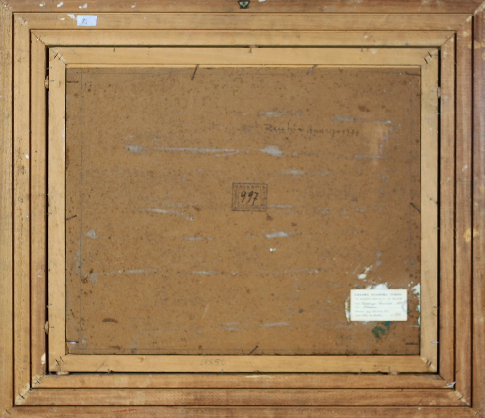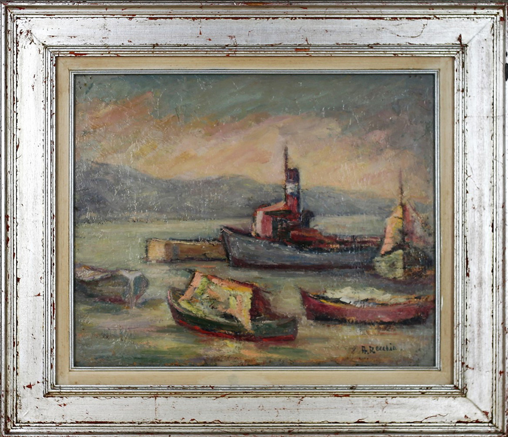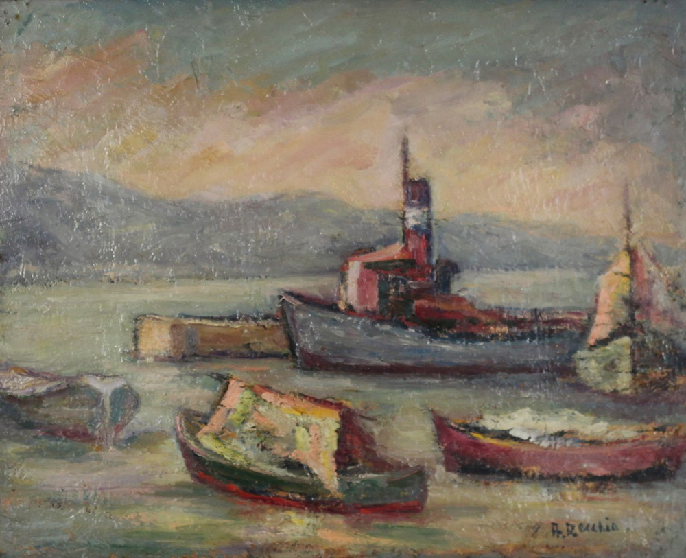RECCHIA AMERIGO, Darsena, Olio su tavola Anno 1970 Dim. 50x61,5 Al verso data e firma Firmato in basso a dx