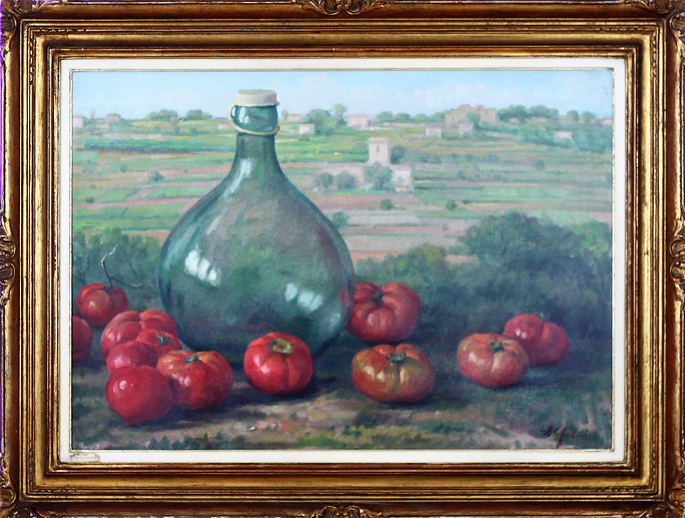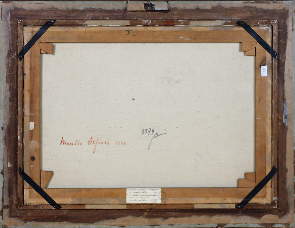 ALFIERI MANLIO (TARQUINIA 1909 GAETA 1991), Natura morta nel paesaggio, Olio su tela Anno 1973 Dim. 50x70 Al verso data e firma Firmato in basso a dx