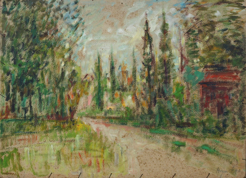 BIGONI FERNANDO, Chiesa di campagna, Olio su cartone Anno 1958 Dim. 50x70 Firmato e datato in basso a dx