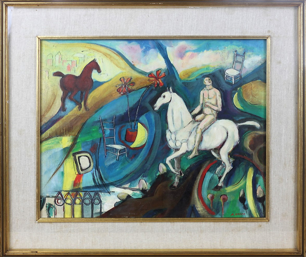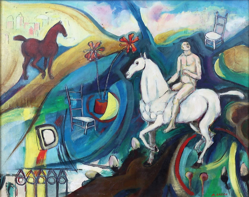Lot 482 | GRECO ALDO (CATANZARO 1923 TORINO 2003), Cavallo, cavagliere e sedia, Olio su...