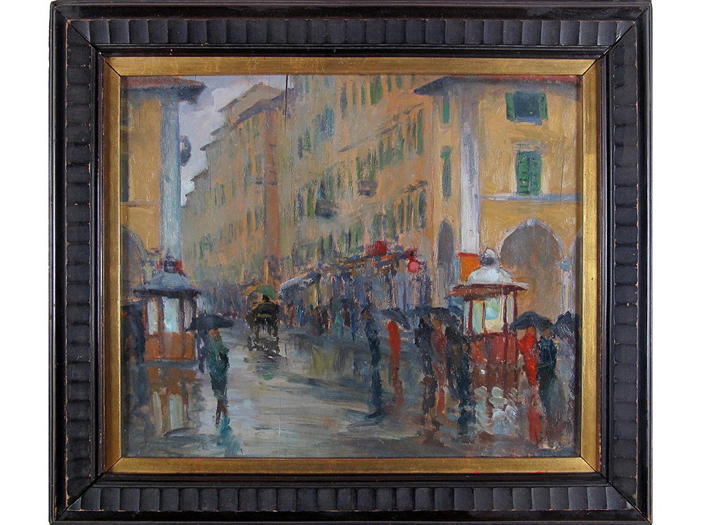 Firma illeggibile (XX secolo) Sotto la pioggia 50x35 cm Olio su comensato