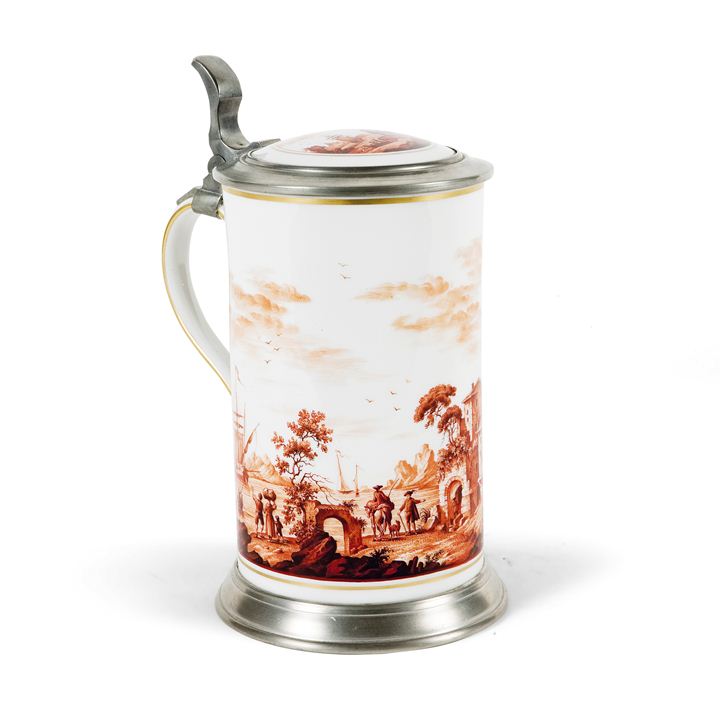TANKARD Tankard in porcellana di Meissen, dipinto con paesaggi e scene di...