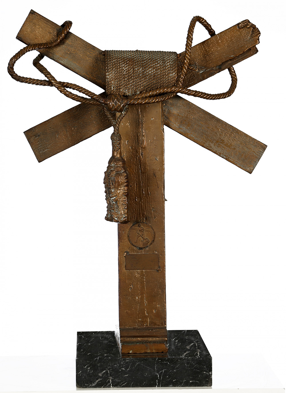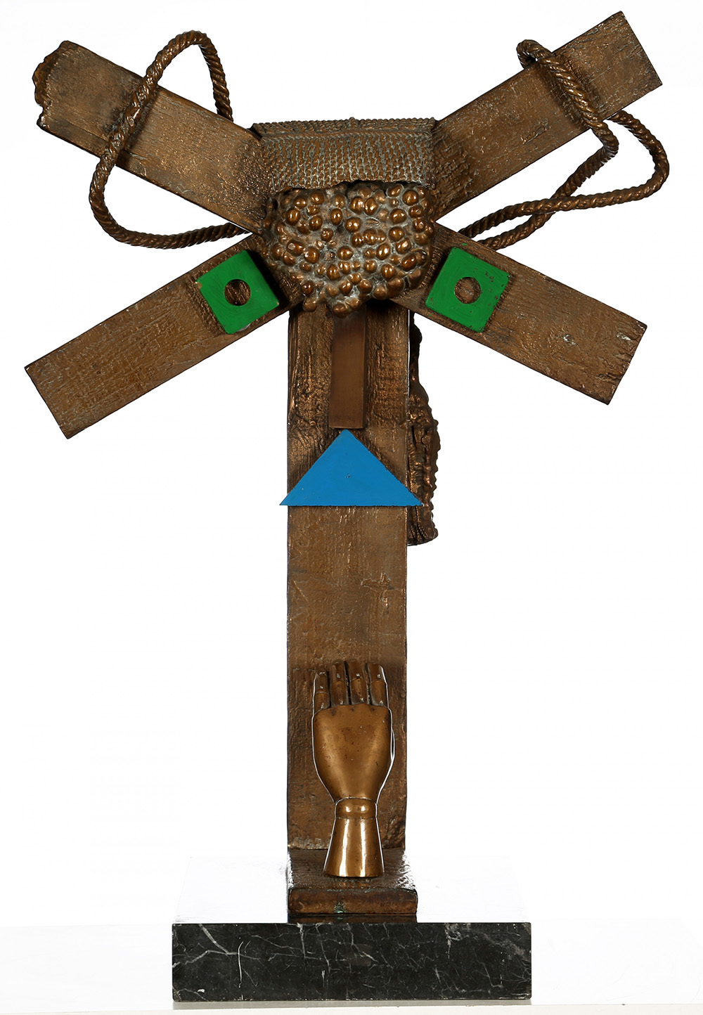 ENRICO BAJ 1924 - 2003 L’ archeologo, 1984 Multiplo, scultura in bronzo, base marmo, cm. 82 x 60 x 28 (di cui base h. cm. 6,5) Illesi International S.a.s Multiples Division Tiratura 40 esemplari + X Firmato sul retro Opera n. 7/X Prov. Collezione Privata