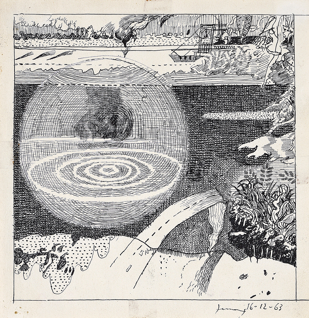 GIANFRANCO FERRONI 1927 - 2001 Paesaggio del lago, 1963 China su carta, cm. 17 x 16,5 Firmato e datato in basso a destra Autentica dell’artista su fotografia Prov. Collezione Privata