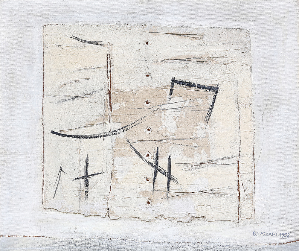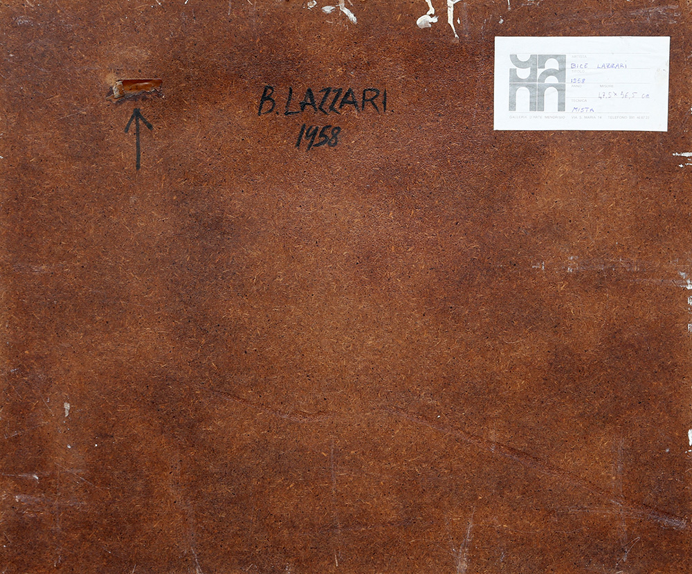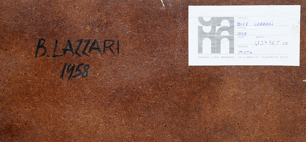 BICE LAZZARI 1900 - 1981 Senza titolo, 1958 Tecnica mista su masonite, cm. 48 x 56,5 Firmato e datato in basso a destra Etichetta Galleria d’Arte Mendrisio, sul retro Certificato di Autenticità a cura dell’Archivio Bice Lazzari, Roma Prov. Collezione Privata