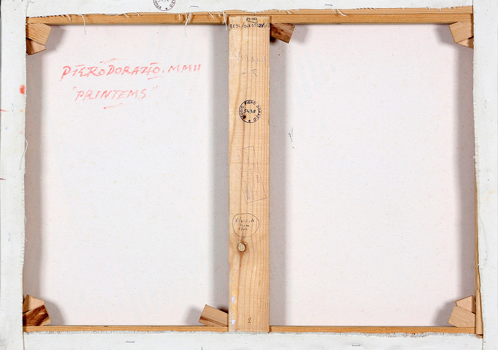 PIERO DORAZIO 1927 - 2005 Printem.s, 2002 Olio su tela, cm. 51 x 71 Firmato e datato sul retro Timbro Studio Piero Dorazio, sul retro Certificato di Autenticità a cura dell’Archivio Opera Piero Dorazio, Todi Prov. Collezione Privata