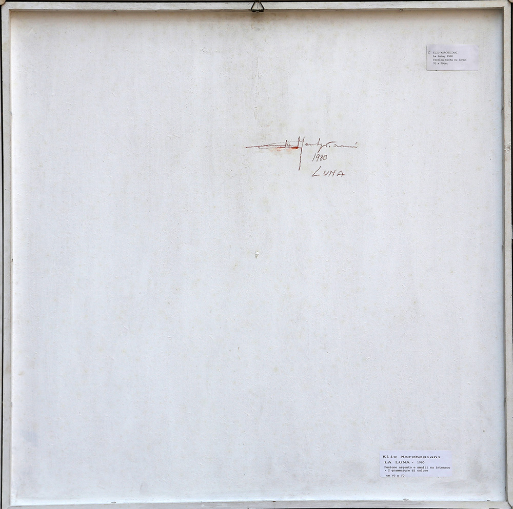 ELIO MARCHEGIANI 1929 La luna, 1980 Tecnica mista su intonaco, cm. 72 x 72 Firmato e datato sul retro Certificato di autenticità a cura dell’artista PUBBLICAZIONI: “Elio Marchegiani. Mens agitat molem”, catalogo mostra Casa del Mantegna, Mantova, 1981, p. 19 Prov. Collezione Privata