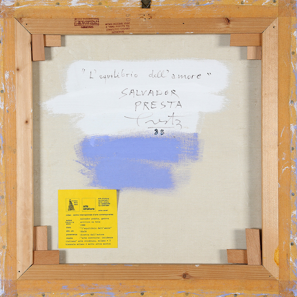 SALVADOR PRESTA 1925 L’equilibrio dell’amore, 1988 Acrilico su tela, cm. 50 x 50 Firmato e datato sul retro Etichetta Arte Struktura, Milano sul retro Timbro Sincron Centro Culturale, Brescia sul retro ESPOSIZIONI :“Arte costruita: incidenza italiana”, Milano, Arte Struktura, 1989 Prov. Collezione dell’artista Prov. Collezione Privata