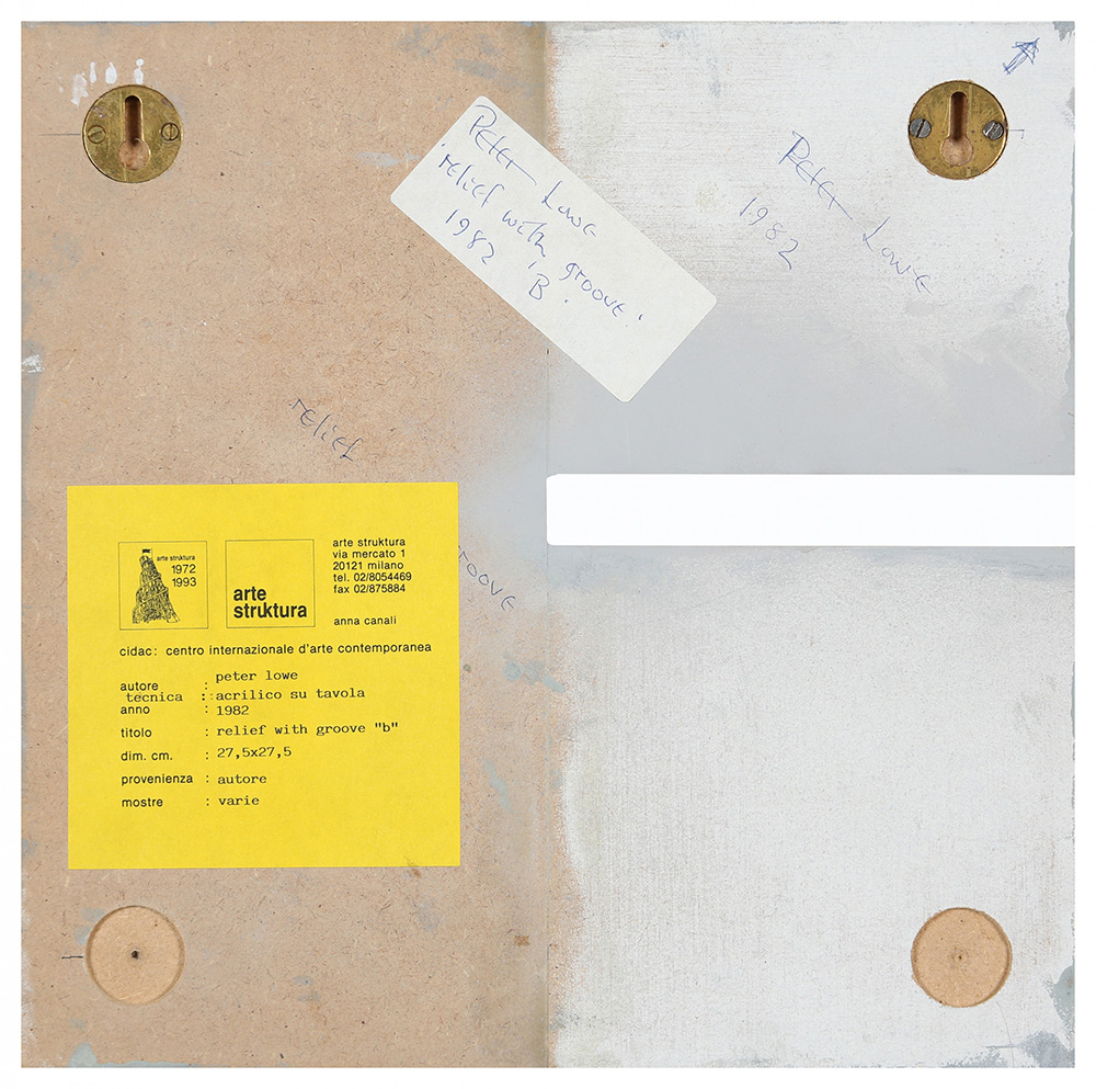 PETER LOWE 1938 Relief with groove “b”, 1982 Acrilico su tavola, cm. 27,5 x 27,5 x 1,8 Firmato e datato sul retro Etichetta Arte Struktura, Milano sul retro Prov. Collezione Privata
