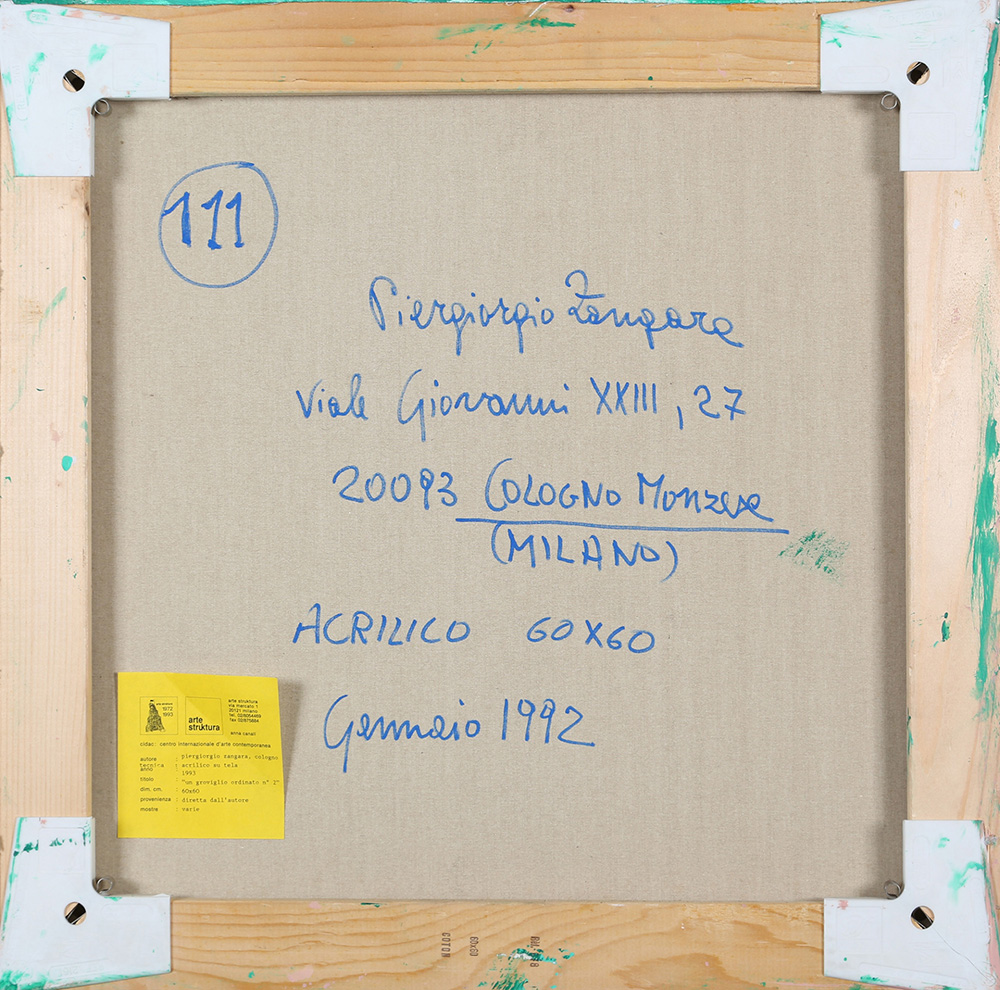 PIERGIORGIO ZANGARA 1943 Un groviglio ordinato n. 2, 1992 Acrilico su tela, cm. 60 x 60 Firmato e datato sul retro Etichetta Arte Struktura, Milano sul retro Prov. Collezione Privata