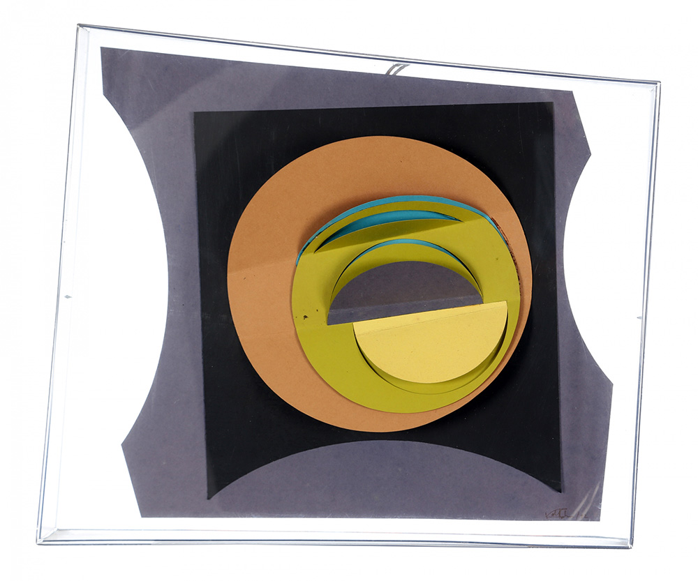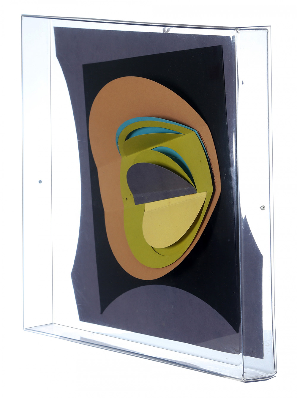 VOLF ROITMAN 1930 Galaxy cadì, 1992 Collage di cartoncini in teca di plexiglass, cm. 40,5 x 46,5 (carta cm. 36 x 42) Firmato e datato in basso a destra Etichetta Arte Struktura, Milano sul retro Prov. Collezione Privata