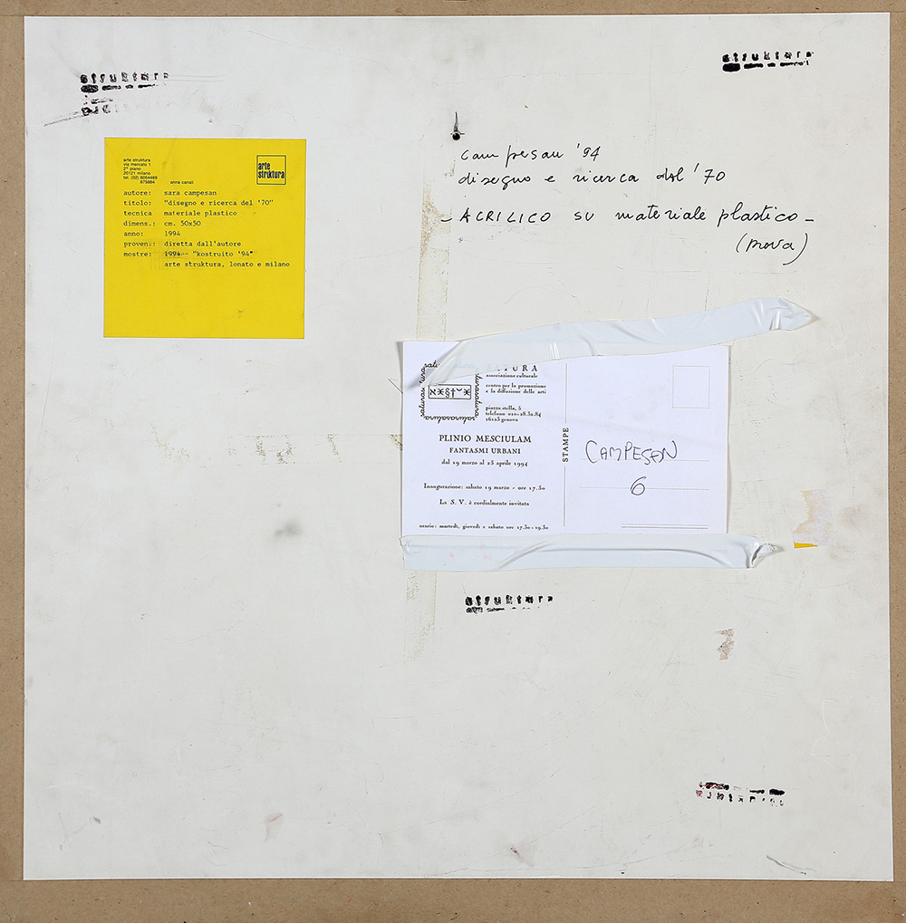 SARA CAMPESAN 1924 - 2016 Disegno e ricerca del ’70, 1994 Acrilico su materiale plastico, cm. 50 x 50 Firmato e datato in alto a destra Etichetta e timbro Arte Struktura ESPOSIZIONI: “Kostruito ’94”, Milano - Lonato del Garda, Arte Struktura, 1994 Prov. Collezione dell’artista Prov. Collezione Privata