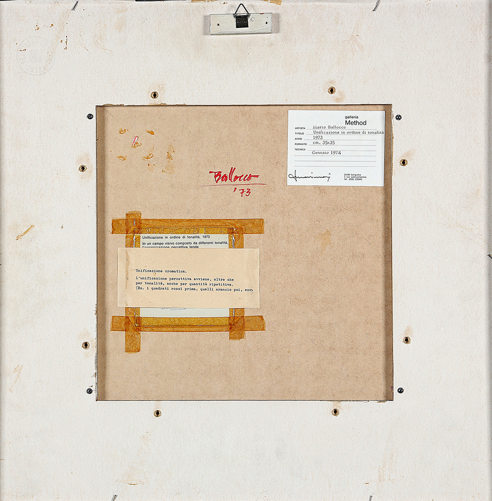 MARIO BALLOCCO 1913 - 2018 Unificazione in ordine di tonalità, 1973 Acrilico su tavola, cm. 35 x 35 Firmato e datato sul retro Etichetta Galleria Method, Bergamo sul retro Autentica dell’artista su fotografia Prov. Collezione Privata