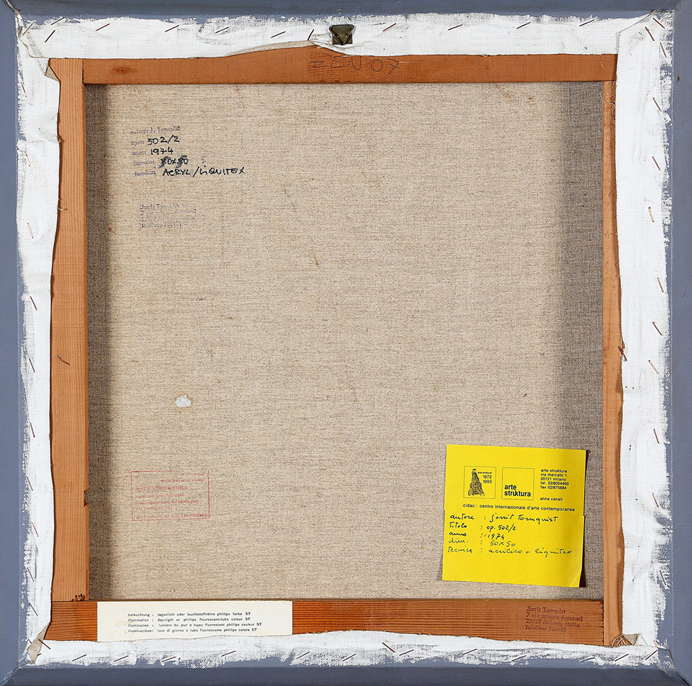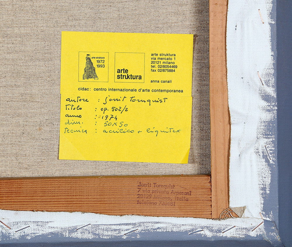 JORRIT TORNQUIST 1938 Opus 502/2, 1974 Acrilico liquitex su tela, cm. 50 x 50 Timbro dell’artista sul retro Etichetta Arte Struktura, Milano sul retro Timbro Arte Struktura associazione culturale, Desenzano del Garda sul retro Prov. Collezione Privata