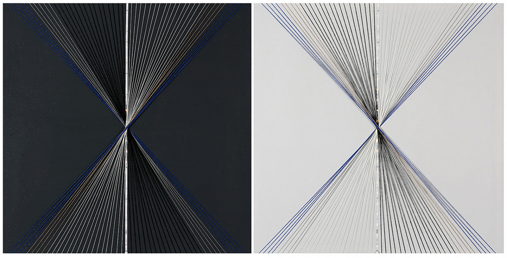 GIORGIA ZANUSO 1985 Gradazione, 2015 Dittico, acrilico, fili e strip led su tela, cm. 100 x 100 cad. Firmato e datato sul retro Prov. Collezione Privata
