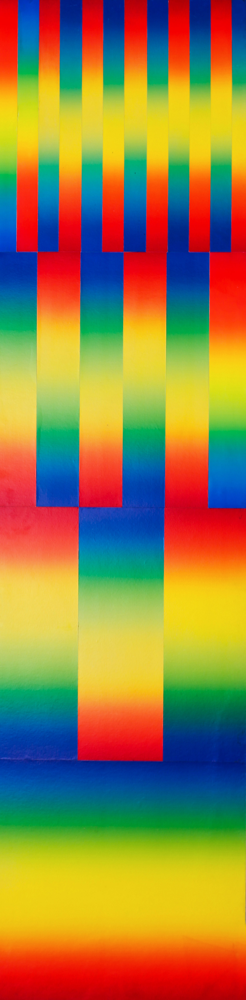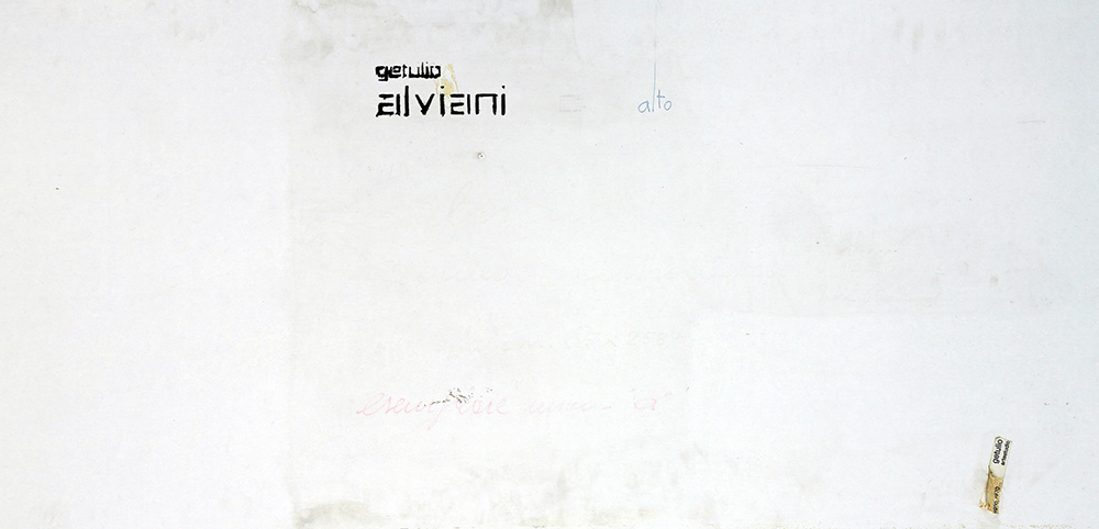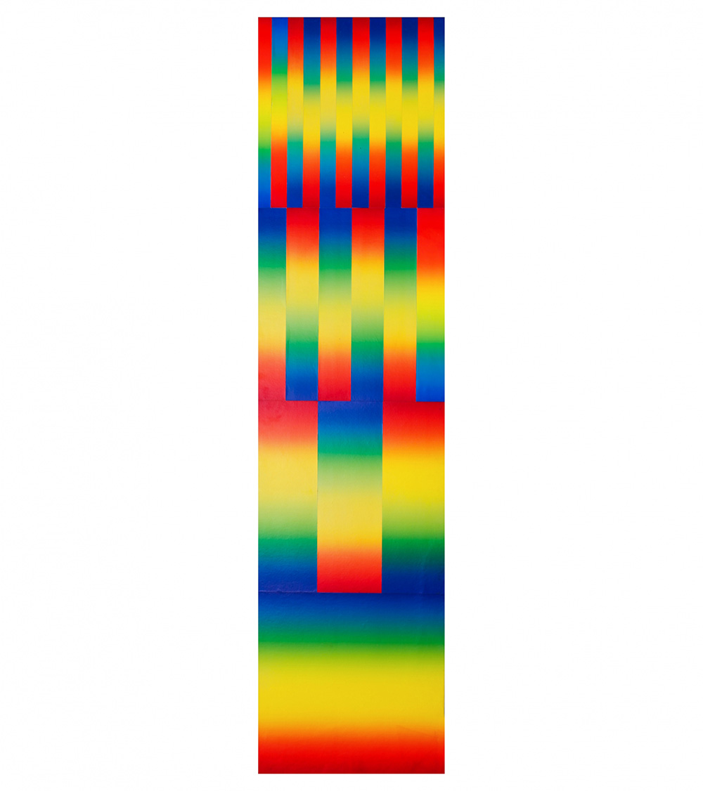 GETULIO ALVIANI 1939 - 2018 Senza titolo, 1970 Collage di cartoni serigrafati su tavola, cm. 65 x 250 Firmato sul retro Etichetta Getulio Artestudio, sul retro Dicitura dell’artista sul retro “Opera unica” Prov. Collezione Privata
