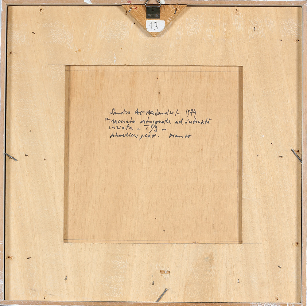 SANDRO DE ALEXANDRIS 1939 Tracciato ortogonale ad intensità variata, 1974 Cartone Schoeller inciso, cm. 30 x 30 Firmato e datato sul retro Prov. Collezione Privata