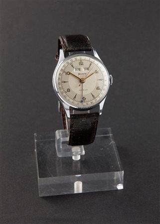 Cassa in tre parti in lega cromata; quadrante bicolore serigrafato con indicazione giorno e mese in finestrelle ad ore 12, datario a sfera