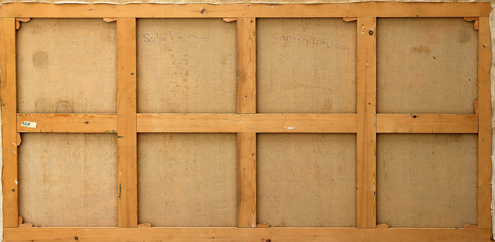 MARIO SCHIFANO 1934 - 1988 Campi profughi, 1991 Smalto e tecnica mista su tela, cm. 160 x 300 Firmato sul retro Certificato di Autentica e Archiviazione emesso in data 30 novembre 1998 a cura della Fondazione Mario Schifano onlus, Roma Opera in fase di Archiviazione presso l’Archivio Mario Schifano, Roma Monica Schifano ha confermato l’autenticità dell’opera tramite e-mail PUBBLICAZIONI: “60 . 90 Trenta anni di avanguardie romane”, catalogo mostra Palazzo dei Congressi, EUR, Roma (marzo 1991), Edizioni Carte Segrete, Roma, p. 131 Prov. Collezione Privata