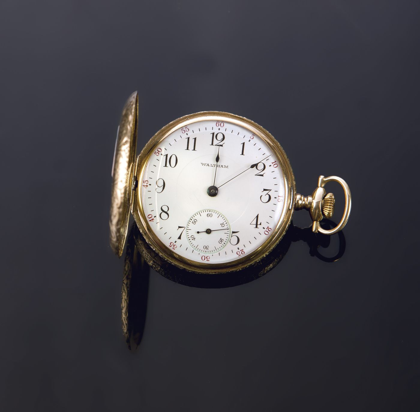 WALTHAM Orologio da tasca in oro 14 Kt, inizi XX secolo Diam. 47 Tripla cassa in oro, ricca incisione floreale e simbologia massonica; quadrante in smalto con numeri arabi, secondi alle 6
