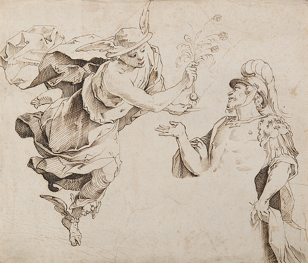 Artista del secolo XVIIMercurio dona a Odisseo l'erba MolyPenna e inchiostro...