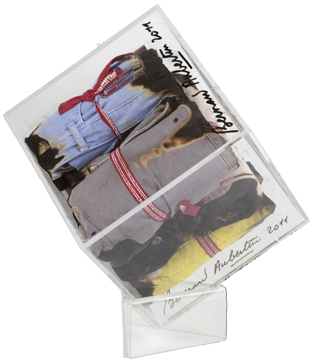 Bernard Aubertin Fontenay-aux-Roses 1934 - Reutlingen 2015 "Unlimited, 2011" tecnica mista jeans combusti opera unica n.6 jeans marca Unlimited combusti e arrotolati entro teca cubo in plexiglas firmata dal Maestro e datata 2011 cm 27x27x27 Certificato rilasciato dalla Galleria Casa d' Aste Federico II - Bari