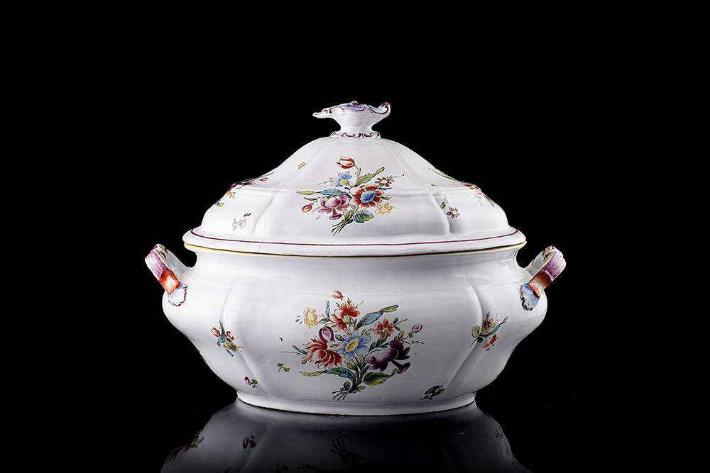 Manifattura Ginori, secolo XVIII. Zupppiera biansata in maiolica decorata in policromia a fiori sparsi. Coperchio con presa sagomata (largh. cm 31) (mancanze e restauri)