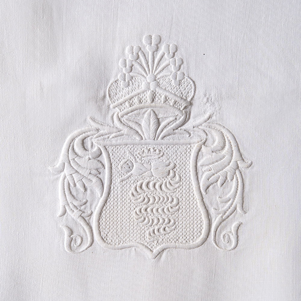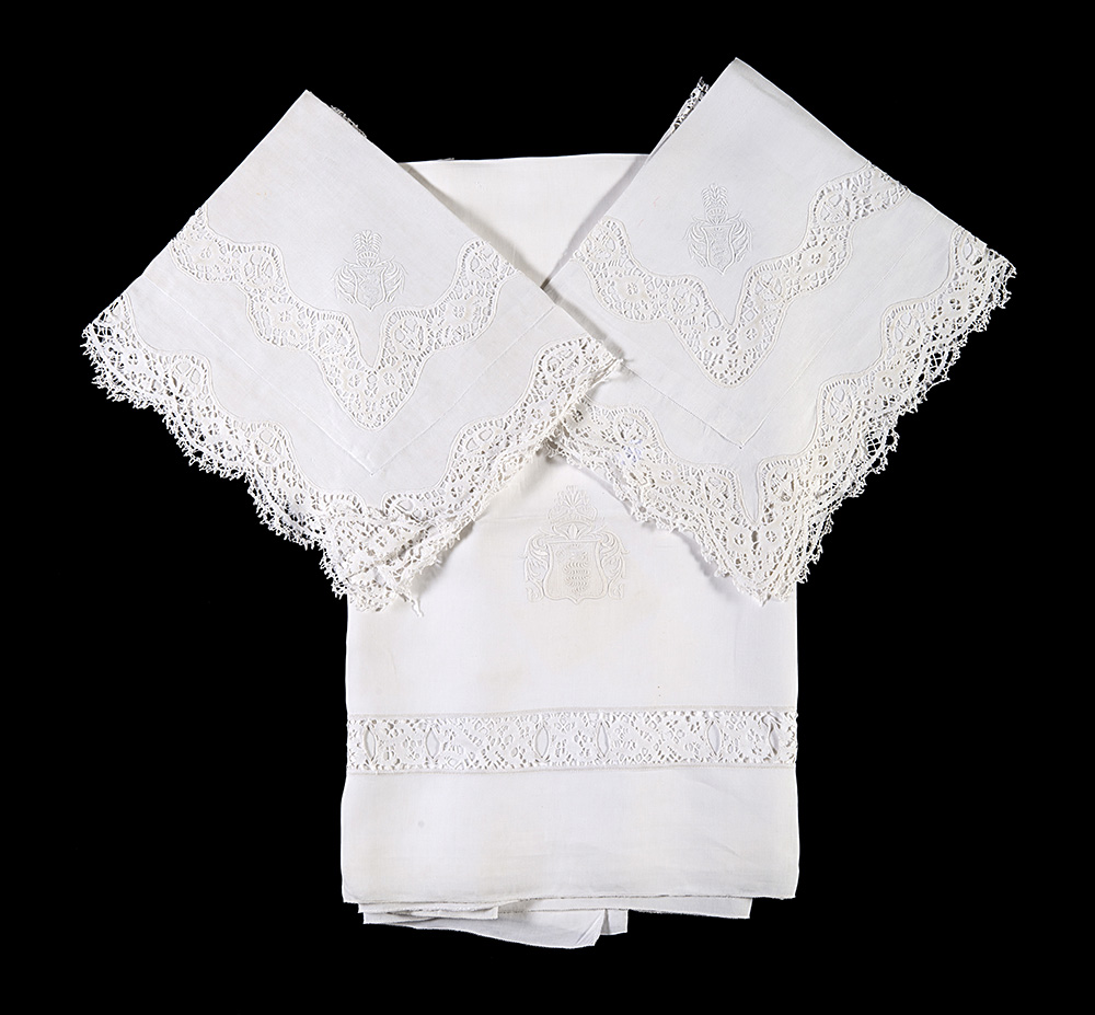 Double-bed sheet set decorated with lace strips embroidered with the Visconti family crest. 20th century (defects)
