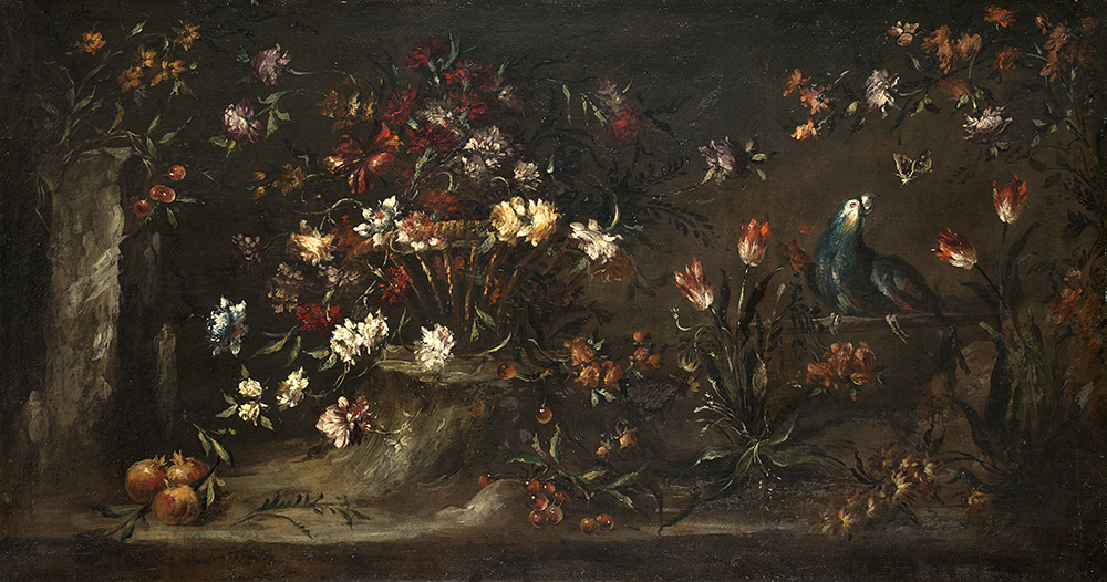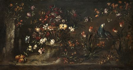 Maestro del secolo XVIIVaso fiorito in un paesaggio con volatile e...