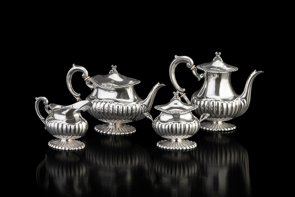 Servizio da tè e caffè in argento composto da caffettiera, teiera, lattiera e zuccheriera con corpo a balaustro baccellato e godronato. Cimature a tutto tondo in figura di putti abbracciati. Vercelli, metà secolo XX (g 840 ca.) (lievi difetti)