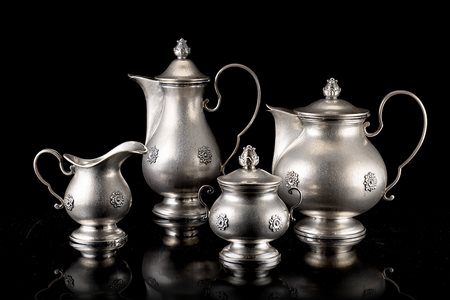 Servizio da tè e caffè in argento composto da teiera, caffettiera, zuccheriera e lattiera; corpo a balaustro con superficie zigrinata decorata da applicazioni di rosette stilizzate; manici a doppia voluta e pomoli a bocciolo. Italia, metà secolo XX. Marcati Melli (h. max cm 17,5 ca.) (g 930 ca.) (difetti)