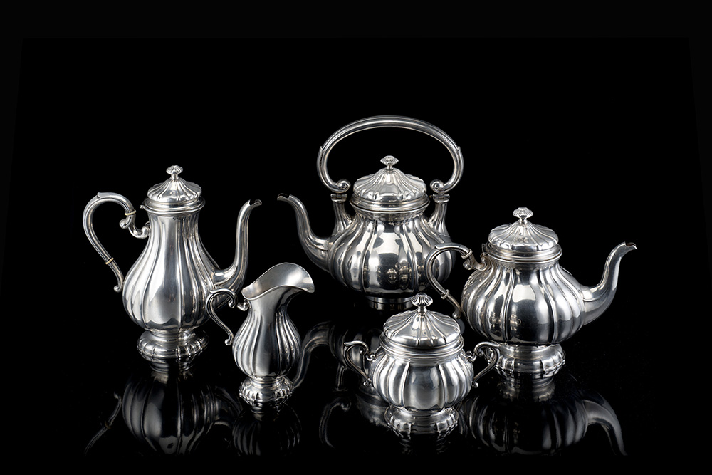 Servizio da tè e caffè in argento composto da samovar, teiera, caffettiera, zuccheriera e lattiera; con corpi