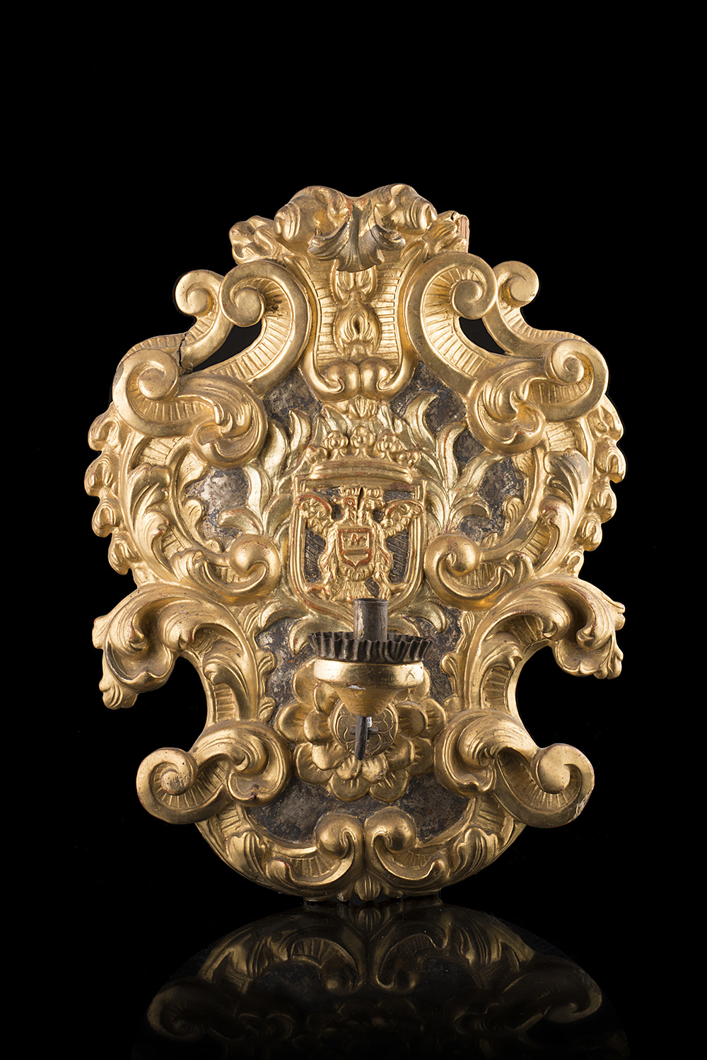 Applique in legno intagliato e dorato a volute e girali di fiori, centrata da stemma marchionale con aquila bicefala del Sacro Romano Impero e scudo. Reggitorcia in metallo e legno. Secolo XVIII (h. cm 45) (difetti)