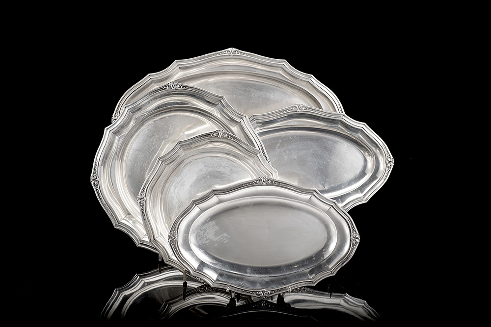 Part of a silver set composed of three oval silver tray and two silver stand (g. 4500 ca.)