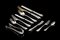 forchette, undici cucchiai, diciassette coltelli da frutta, dieci cucchiai tè, tre posate a servire, una pinza per il