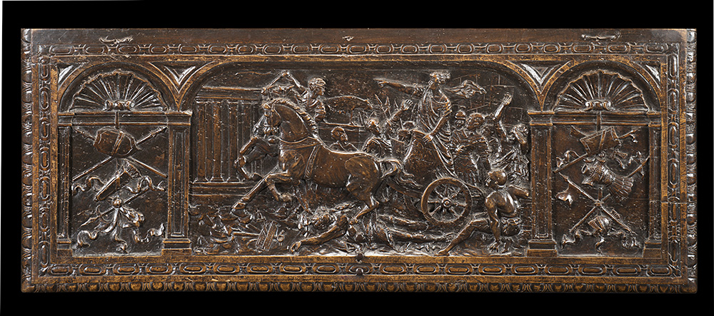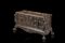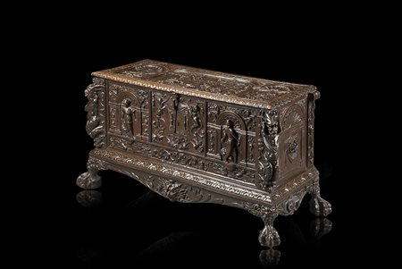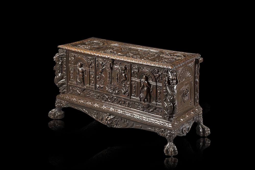 Antico cassone in noce interamente scolpito, fronte centrato da cartella con figure alate tra due arcate con figure femminili in abiti classici e grottesche. Montanti scolpiti a mostri alati. Coperchio tripartito decorato a vittoria in trionfo entro paesaggio con architetture classiche tra due trionfi d'armi. Poggiante su base centrata da mascherone, piedi ad artiglio. Maniglie laterali (cm 166x85x70) (difetti e restauri)