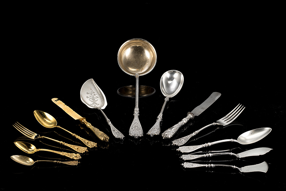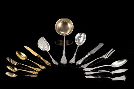 Servizio di posate in argento e vermeille composto da ventidue forchette, ventidue coltelli e dodici cucchiai, dodici forchette, dodici coltelli e dodici cucchiai da frutta, undici cucchiai da tè e cinque posate a servire. Manici con decori alla "berain" e mascheroni. Germania, fine secolo XIX (g tot. 5390 ca.)