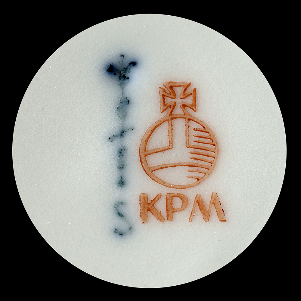 La Regia Manifattura di porcellana di Berlino (K.P.M. Konigliche Porcellan Manifaktur Berlin) fu fondata a Berlino nel 1763 da Federico II di Prussia che incaricò di produrre diversi servizi da tavola di rappresentanza in stile rococò da utilizzare anche come regali diplomatici (ad esempio l’imponente servizio da tavola donato a Caterina di Russia e oggi all’Ermitage di San Pietroburgo). La marca della Regia Manifattura è lo scettro reale in colore blu cobalto sotto vernice utilizzato singolo fino al 1832. Dal 1832 i pezzi in porcellana recano, accanto allo scettro, anche il globo imperiale