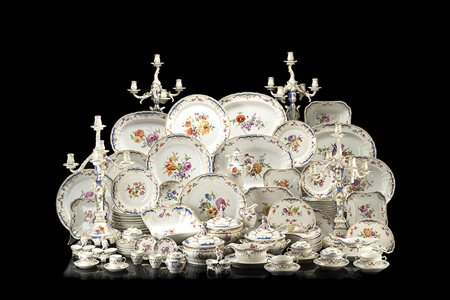 Manifattura K.P.M., Berlino, secolo XIX. Parte di servizio da tavola in porcellana di ricche forme rocaille. Preziosa decorazione a mazzetti di fiori policromi. Bordure a riserve a unghiature blu su fondo blu. Ricchi profili e decori in oro. Le prese dei coperchi delle zuppiere e le saliere sono piccole plastiche in forma di putto. Composto da: quattro candelieri a cinque luci (h. cm 62); quattro piatti tondi da portata (d. cm 35); sette piatti ovali da portata (cm 40x30 circa); quattro insalatiere; sei portasalse con loro cucchiaio; quattro piccole zuppiere (un coperchio è mancante); undici saliere; tre scodelle di forma quadrata; sessantuno piatti piani (d. cm 25,5); venticinque piatti fondi (d. cm 24,5); cinquanta piatti piani (d. cm 23); venticinque piatti piani (d. cm 20); ventisei piatti a mezzaluna per contorni; quattordici tazze da brodo con coperchio con tredici piattini; caffettiera; lattiera; zuccheriera; venti tazzine da caffè con piattino; dodici tazze biansate con piattino. Marca di fabbrica: scettro in blu sotto vernice e globo crucifero con KPM in rosso, numerali (piccole sbeccature e rotture)