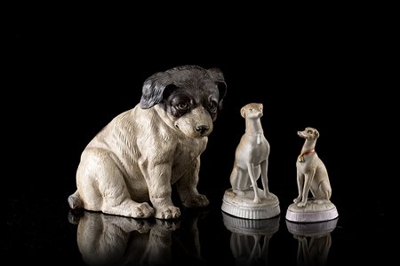 Lotto composto da tre sculture in ceramica e biscuit raffiguranti due Levrieri e un cucciolo (difetti)