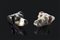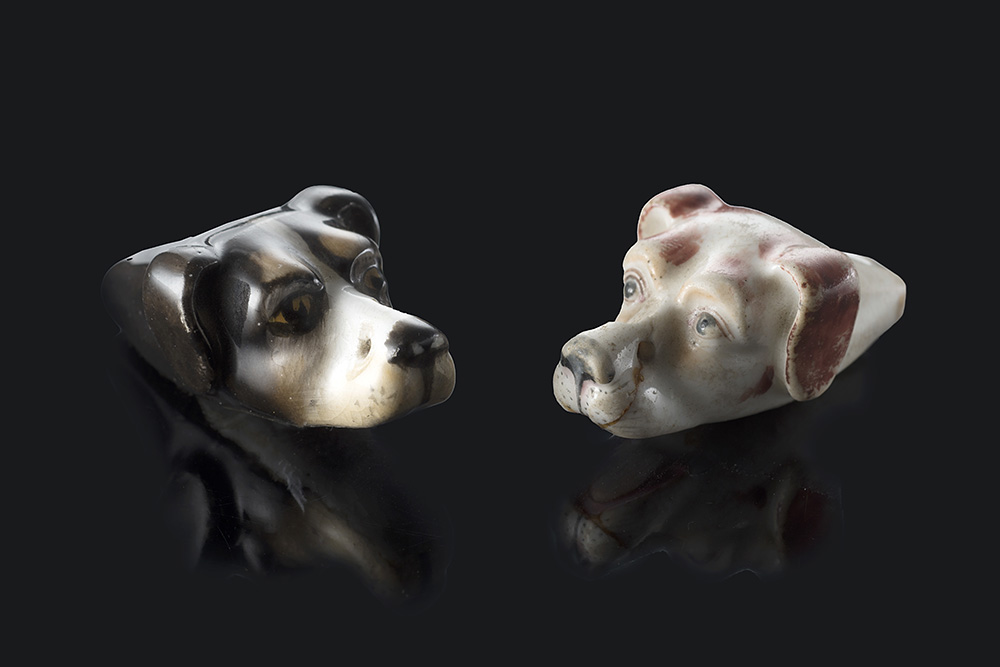 Manifatture del secolo XIX, due fischietti da richiamo in porcellana policroma raffiguranti teste di Bracchi (difetti)