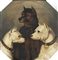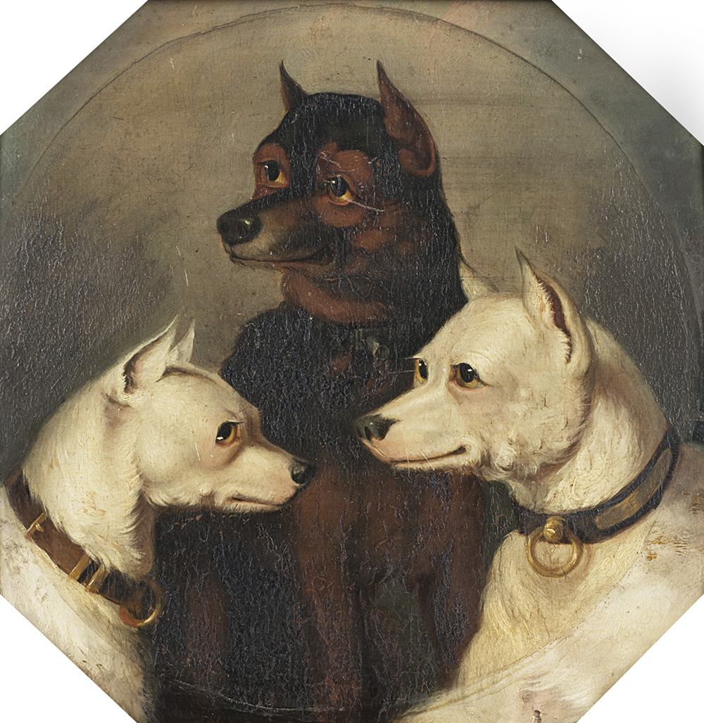Scuola del secolo XIX "Cani" olio su tavola sagomata (cm 24x25) In cornice (difetti e restauri)